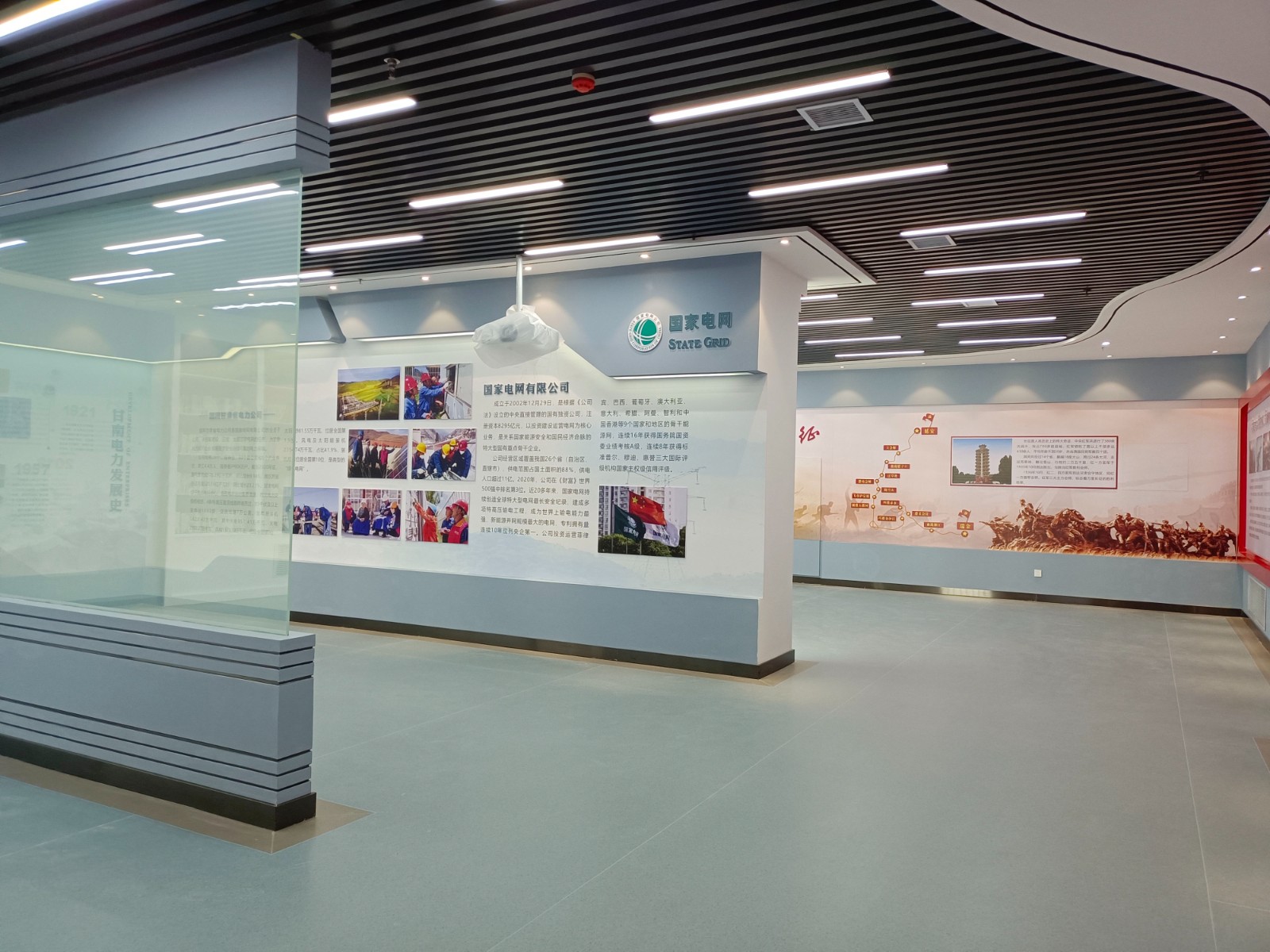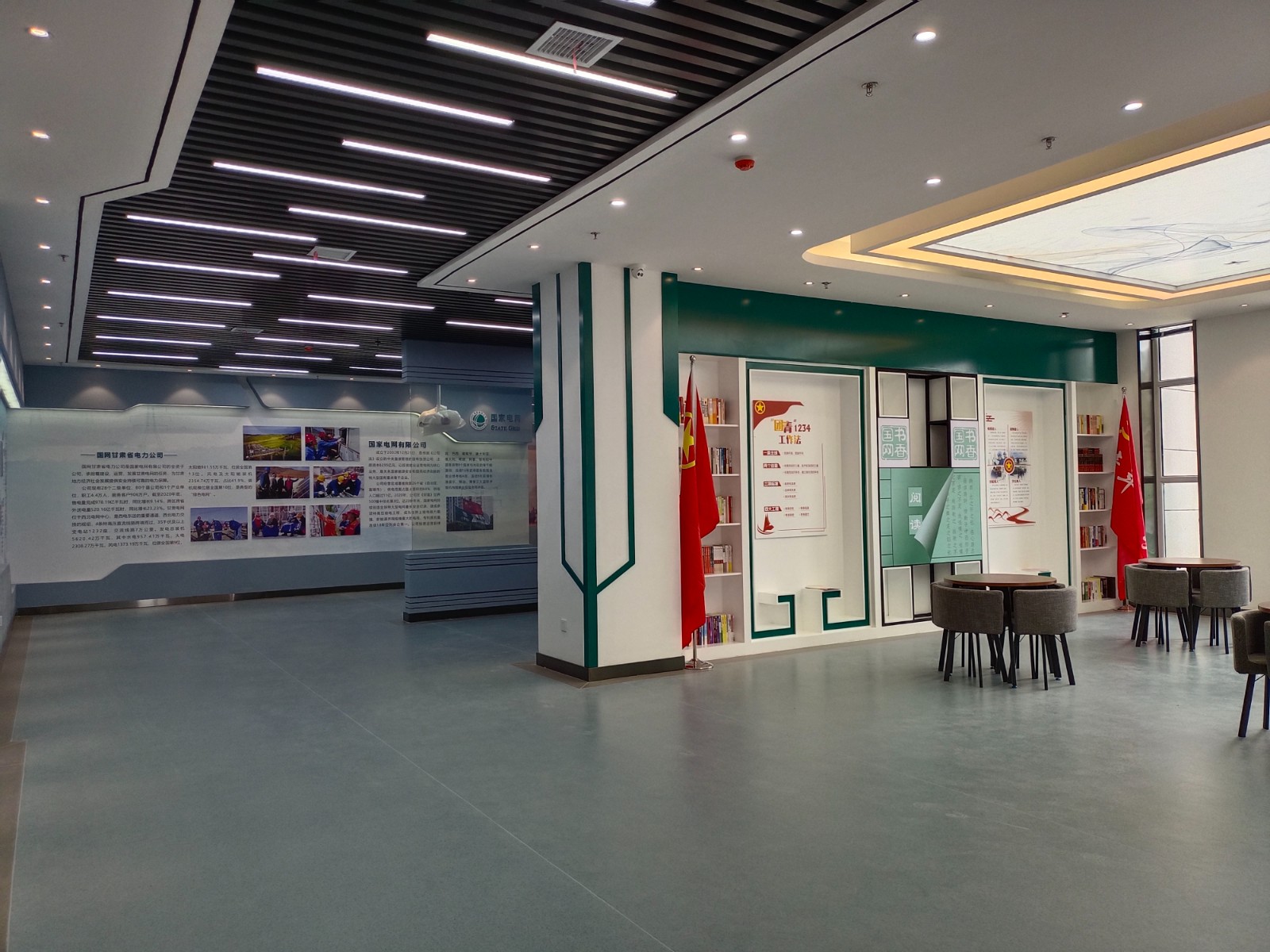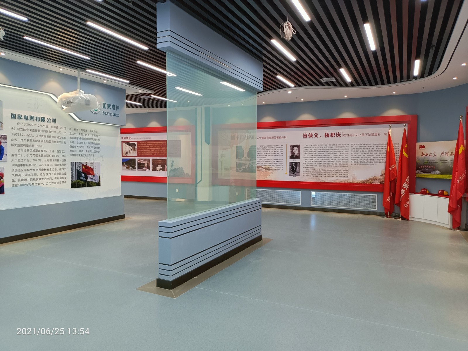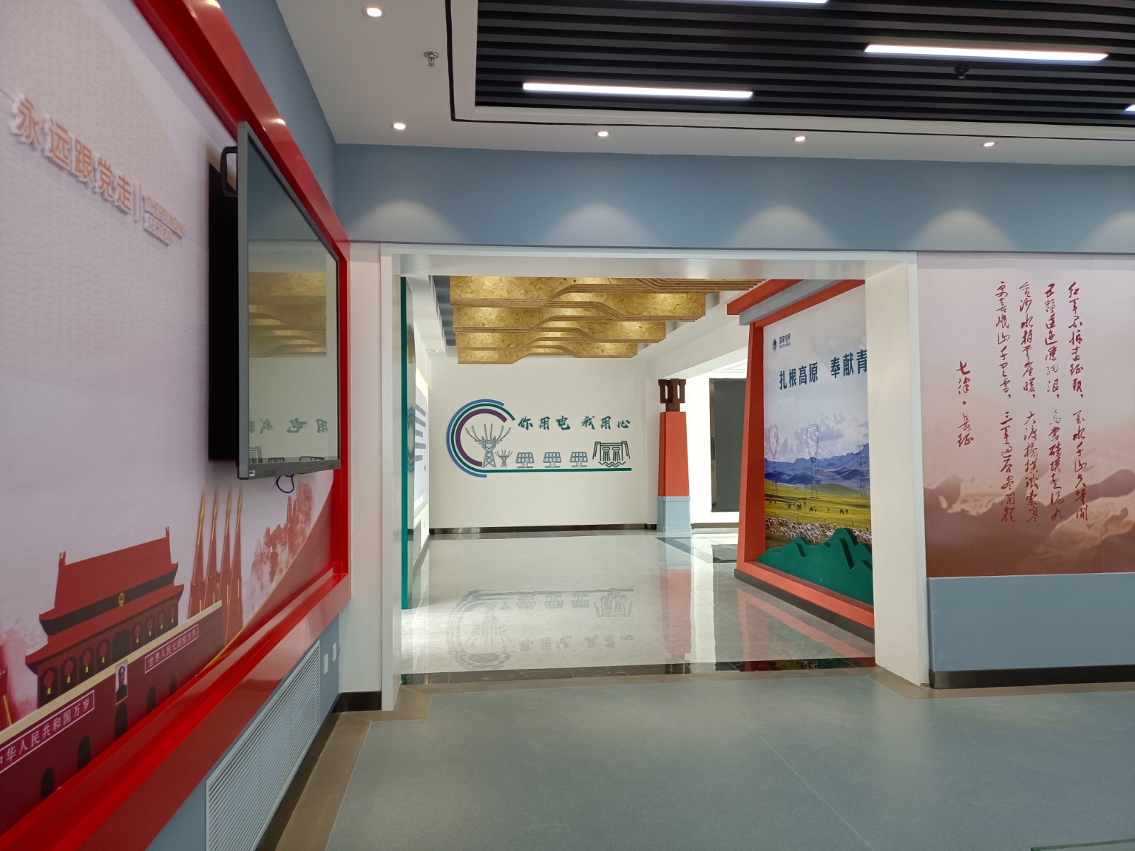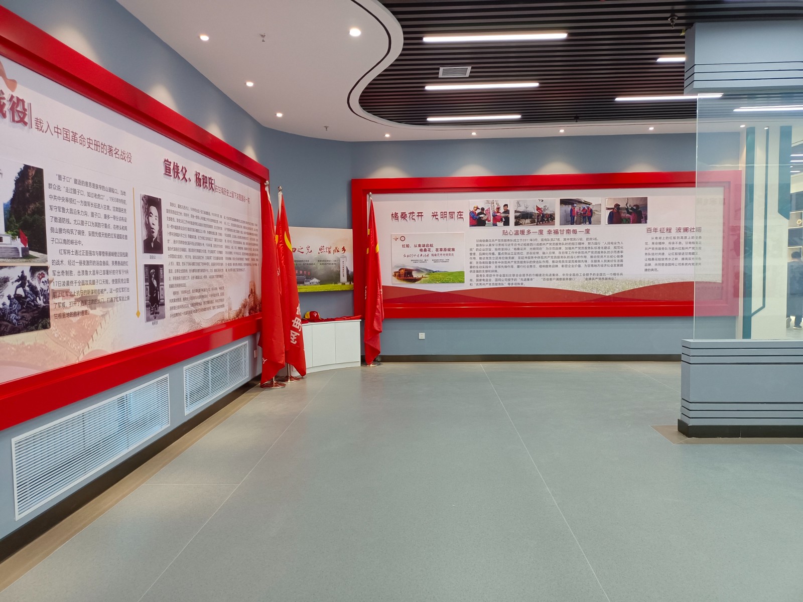 基地一樓為精神文化宣教區(qū)域,共分序言、初心引領、黨旗引頒、紅色甘南黨史教育、電網(wǎng)企業(yè)文化、甘南電力發(fā)展展示、紅色經(jīng)典智慧閱讀等區(qū)域。